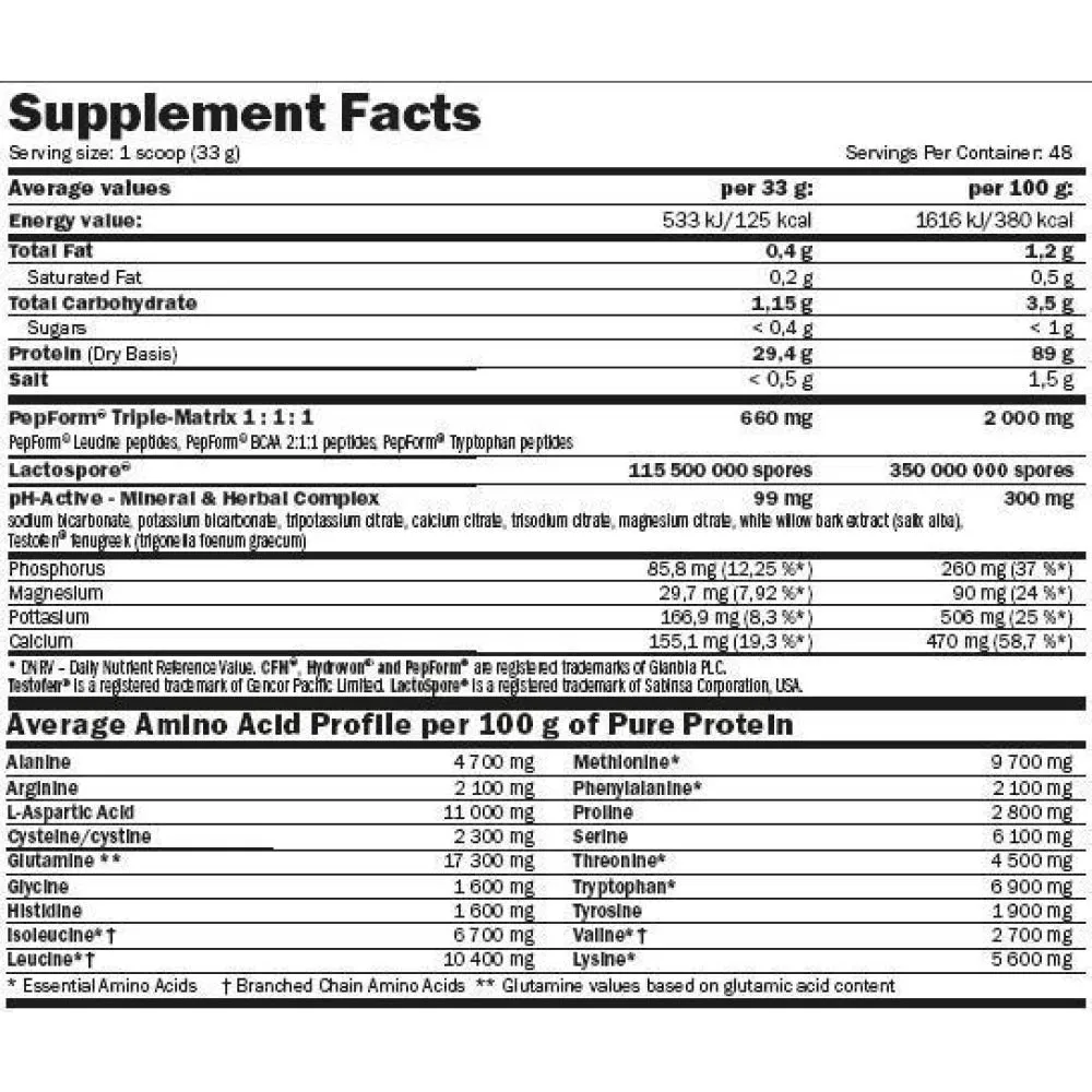 Hydropure â„¢ whey of brand nº1 in europe amix â„¢ nutrition, it is possibly the best market protein, since it contains a new generation of partially hydrolyzed serum protein isolate a triple matrix of pepform® amino acids and enhanced with lactospore â„¢ .hydrovon® 195 probiotics is an isolated of partially hydrolyzed milk serum protein, designed for rapid absorption in our body. Therefore we can accelerate the recovery in an ostensible way after an intense physical activity, with a drink of incredible flavor, since the characteristic bitter taste of the hydrolyzed proteins of the past is eliminated. Hydropure â„¢ whey is a unique product in its category. This is the first isolated in the protein of hydrolyzed milk serum of high -flavor recommended for athletes, both professionals and amateurs, of any sport. Muscle and accelerate recovery after physical activity. It also contains pepform â„¢ triple-matrix, a combination of peptides manufactured by glambia nutritionals, designed for a better benefit of amino acids in muscle tissue, obtaining soluble amino acids and high bioavailability, contributing to a better protein synthesis, which favors muscle growth. Finally, it also contains lactospore® probiotics, a natural ingredient that contains lactobacillus sporogenes, a probiotic micro-organism that promotes the growth and maintenance of intestinal flora. Lactospore â„¢ helps you increase enzymes for better digestion, inhibits the growth of pathogenic bacteria, yeast and parasites, and enhances food bioavailability. In training, avoid muscle catabolism and improve the recovery phases.- contains hydrovon® 195, an insulated serum protein of latest generation milk.- low carbohydrate and fat content.- includes pepform â„¢ triple-matrix, a matrix of amino acids with greater bioavailability.- potentiated with lactospore® for the growth and maintenance of the intestinal flora.- contains ph-active- mineral & herbal complex that includes testofen®. – high concentration of bcaa´s. – with a really delicious flavor.- sweetened with stevia extract and succral.- aspartamo free and filling ingredients.- 48 doses per container. Additional informed-active- mineral & herbal complex acts balancing the acid/alkaline ratio of alkaline of our organism. This complex is composed of a mineral base such as sodium bicarbonate, potassium bicarbonate, typotasic citrate, calcium citrate, citratotrisodic and magnesium citrate, along with a mixture of extract of the suceblanco cortex (salix alba) and testofen® fenogreco (trigonella foenum graecum) .testofen® extract fenogreco (standardized for 50% phenusides) (trigonella foenum-graecum l.). Testofen® is a powerful herbal compound that has shown that it is able to stimulate the production itself in the body of androgens, increasing muscles, strength and increase sexual impulse. With the use of testofen®, body composition can be significantly improved, increase the anabolic hormonal state and regulate insulin levels. Contains pep-form â„¢ triple-matrix, a patented raw material based on three amino acid combinations that contributes peptides rich in leucine, in branched amino acids and in a tryptophan of serum protein isolated. This novel compounds contribute greatly to protein synthesis and muscle growth. Each dose combines leucine, bcaas and tryptophan with an exclusive supply system of hydrolyzed peptides supply of peppering pending protein isolated patent protein called patent called pepform®. Pepform® develops a revolutionary technology that develops peptides, designed to improve the solubility and absorption of bioactives. Pepform® significantly support the bioavailability of amino acids, with better efficiency and absorption, such as leucine, bcaas and tryptophan. It is a new product patented by nutritional glanbia, which produces exclusive peptides obtained through a patented process in which they are bind .lactospore® is a preparation containing viable spores of the bacteria bacteria bacillus coagulans. Probiotics are living microorganisms that administered in adequate quantities, provide benefits to the health of the organism that ingests it. Bacillus coagulans is the only probiotic with the ability to form spores, capable of surviving without nutrients and are extremely resistant to adverse factors, being resistant to gastric ph, the attack of bile acids and extreme conditions such as processing and storage of the food. Once the intestine reaches, the microorganism develops and ends its spore phase. This mixture of probiotics also favors digestion, improves the bioavailability of nutrients and stimulates the presence of bacteriassables in the stomach. Taking a product that contains lactospore® helps you maintain a significant digestive system while maintaining the intestinal flora, supporting the immune system and lasalud in general. Lactospore® is a brand recorded by sabinsa corporation, usa.amix â„¢ high-class amix â„¢ high -class series is a line of products of the highest quality, with unique ingredients and the best patented raw materials, which has been designed for athletes to obtain the best result. Ingredients cfm® isolated from partially hydrolyzed milk serum protein – hydrovon® 95%, cocoa powder (only for flavor: double chocolate and peanut butter cookies); pepform®-l-leucine peptides (milk serum peptides, l-leucine peptides, l-leucine), pepform®-bcas peptides (whey peptides, bcas peptides, l-leucin, l-isoleucine , l valine), pep-form® tryptophan peptides (milk serum peptides, l-triptophafan peptides, l-tripotophan), stabilizer: guar rubber; aroma; dye: beet extract (only for strawberry yogurt), curcumin (only for creamy vanilla flavor); sodium chloride; emulsifier: soy lecithin; sodium bicarbonate, potassium bicarbonate, tripotasic citrate, calcium citrate, trisodium citrate, magnesium citratode, white sauce bark extract (salix alb sucralosa yaceulfame-k; lactospore â„¢ (bacillus