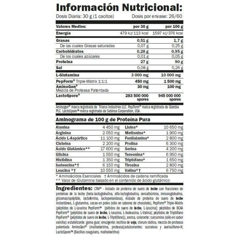 Isohd® 90 cfm amix â„¢ advanced nutrition protein it is a protein with 90% purity that contains cfm® whey protein from nutritional glanbia, considered by many as the best serum isolated in the world, due to its great purity, excellent aminogram and maximum bioavailability, with one of the highest biological values ​​that exist. ®, in order to offer a product of the highest quality and functional, with which to respond to the expectations of the most demanding athletes. It is a pure isolated of high quality milk serum and rapid absorption, which has been manufactured with a state -of -the -art technology that provides a very high biological value so that together with training, let´s get a great muscular definition in a healthy and safe way. Thank you to the method of exclusive and patented cfm®, a natural non -chemical method, the integrity of proteins and their biological activity is maintained. In addition, fats are reduced to only 1.7%, carbohydrates to only 0.95%, and 0.05%sugars. It is, without a doubt, one of the highest quality proteins in the market. .beneficiosprincipals benefits of isohd® 90 cfm amix â„¢ advanced nutrition:- isolated serum protein of rapid digestion and assimilation cfm® original glanbia.- great purity protein and highly instantaneous.- very low in fats and sugars.- it has a very high protein content with the greatest biological value.- contains lactospore â„¢ and aminogen®.- contains pepform â„¢ triple-matrix (l-leucine, bcaas and triptophane) .- it provides optimal muscle recovery. – promotes muscle mass increase and/or maintenance.- 60 dose per container. Additional fmd® 90 cfm protein contains isolated serum protein with cfm® protein fractions (crossflow micro-philtration) original glanbia® together with other top -quality raw materials such as pepform â„¢, aminogen® and lactospore®, in order to offer a product of the highest quality and functional, with which to respond to the expectations of the most demanding athletes. Contains cfm® whey protein original of glanbia.isohd® 90 cfm protein is formulated with cfm® whey protein (cross-flow micro-philtration) of glanbia, it is probably the best serum isolated in the world, due to its great purity, excellent aminogram and maximum bioavailability, with one of the highest biological values ​​that exist. This protein is ideal to increase muscle mass without contribution of fats and added hydrates, stimulates the production of nitric oxide to induce sustained energy and favors muscle recovery. It is important to highlight the difference between cross-flow microfiltration and cfm® of glanbia cross-flow microfiltration simply refers to the cross-flow microfiltration process that can use any brand, however cfm® is the name of the product of the nutritional milk protein protein brand. Cfm® also refers to the unique process that glanbia uses to create its wpi (whey protein isolate), which could also be described as a cross -flow microfiltration, only that it is a process much better than any other generic microfilter since glanbia secured the rights on cfm® acronym being the first company in the world to use cross -flow microfiltration technology. Original that appears in each of its containers, so you are certain of you are paying for the best isolated in the market. It contains 3 grams of glutamine and 450 mg of pepform â„¢ triple -matrix per service. L-glutamine is the most abundant amino acid (non-essential) in the body, which includes more than 60% of the free amino acid reserve in the skeletal muscle and greater than 20% of the total circulating amino acids. L-glutamine plays a very important role in protein synthesis and in the regeneration of muscle tissues, in addition to reinforcing the immune system. The pepform â„¢ triple-matrix matrix contains a combination of amino acid peptides: pepform â„¢ bcaa 2: 1: 1, pepform â„¢ leucine peptides and pepform â„¢ tryptophan peptides in a ratio of 1: 1: 1. This combination gives us rich peptides in bcaa´s, leucine and tryptophan, obtained by a patented process in which they are binded freely to amino acid peptides from the isolated of fresh and sweet milk serum through fractionation technologies and very separation advanced obtaining soluble amino acids and a high bioavailability. Aminogen® is a natural mixture of the digestive proteases aspergillus niger and aspergillus oryzae that has been created and patented by triarco industries inc. The function of these two enzymes is to help a correct and rapid digestion of the proteins consumed with the diet or of the food supplements. Both enzymes intervene in the proteolytic rupture of proteins in the intestine. When our body has broken down in amino acids, aminogen® helps absorb more amino acids and in a faster way. When an increase in muscle mass is desired, large amounts of proteins are usually consumed). One of the alternatives to increase the amount of protein in the diet are protein shakes. The average protein absorption rate by the intestine is about 20 grams of protein, however many products provide higher quantities and to facilitate that this protein can be assimilated correctly can use digestive enzymes such as those of the aminogen® patented complex. Different studies with these enzymes have shown that the absorption of proteins is improved and also increases the concentration of blood amino acids, this in turn contributes to greater nitrogen retention. Another advantage that studies conducted with aminogen® have confimed is that it has been observed that it is able to reduce c -reactive protein (the reactive c protein is produced by the liver and its level rises when there is inflammation in the body). The concentration of blood amino acids is related to the stimulus of protein synthesis, for this reason the consumption of protein together with aminogen® helps increase adaptations to training and muscle mass gains. In a clinical study it h