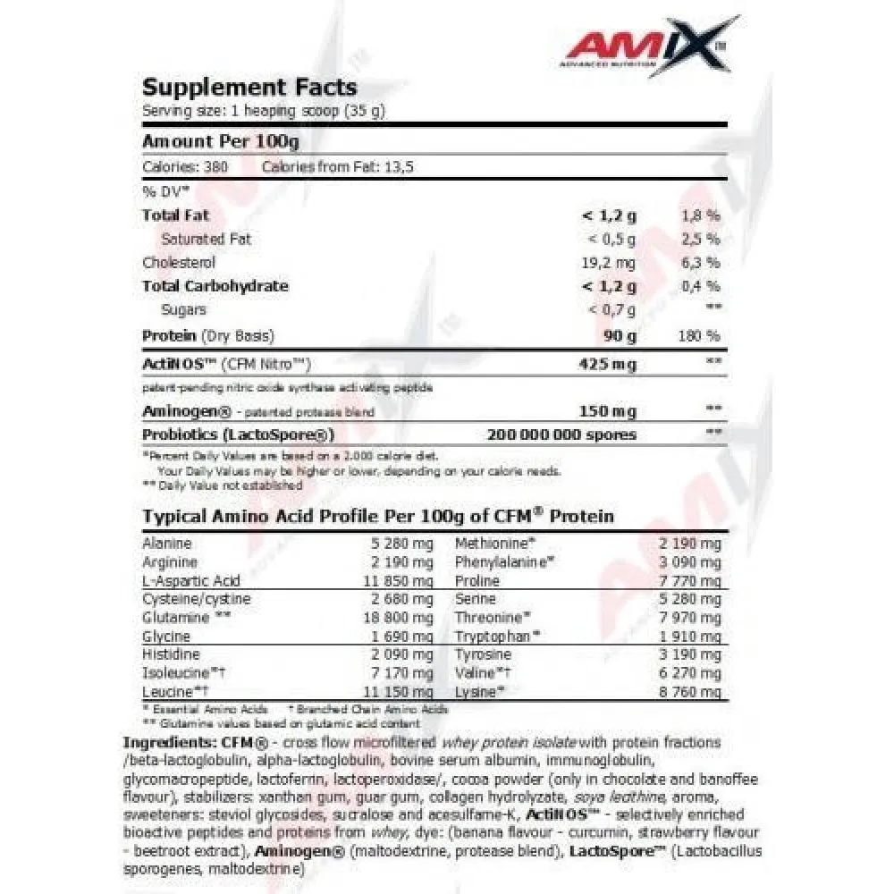 The isoprime cfm protein formula of amix nutrition carries no less than 90% purity, it is a pure isolated of serum of a quality milk with an insurmountable biological value. Amix nutrition cfm of amix nutrition contribute to your muscles a rapid recovery after the training next to a very rapid absorption. Amix nutrition cfm contains a high amount of l-glutamine and branched amino acids. Amix nutrition cfm is free of aspartam amix nutrition is one of the highest quality proteins in the market. Cfm (isolated from cross-flowing serum protein by cross flow with beta-lactoglobulin, alpha-lactoglobulin, albumin of bovine serum, immunoglobulin, glycomacropéptides, lactoferrin, lactoferrin, lactopharine) (in cocoa flavor), aroma, xantan rubber, guide rubber, exclusive digestive enzymes digesive (amylase, l l ipasa, lactase, cellulasa, proteasa), acesulfamo k, sucralosa. Employment modo basic dose of isaprime cfm of amix nutrition is formed by dose of 28 gr. (1 dosing) dissolved in 200 ml of water, skim milk or their favorite drink. Preferably water.presentaciónnevase 2 kg.