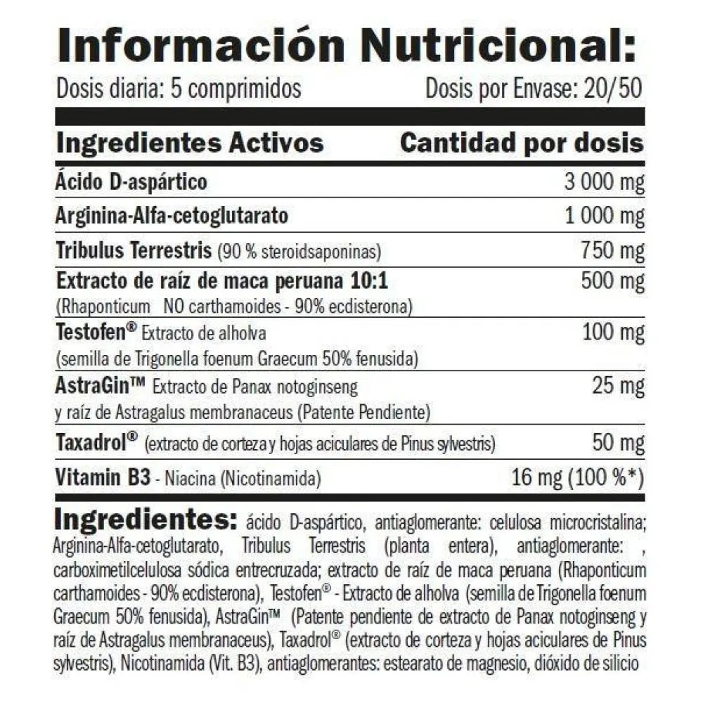 Testo f-200® of amix ™ advanced nutrition is a new and complete supplement specially designed with the best ingredients to help naturally increase the testosterone level. Testo f-200® provides the body with the necessary nutrients and in adequate amounts for an optimal completely natural pro-stosterone effect and without side effects. It continues ingredients of proven efficacy such as d-aspartic acid, alpha-zo-zetoglutarate arginine, the extract of extract of tarrestris tribulus, maca´s root extract, along with state -of -the -art patented compounds such as testofen®, astragin ™ or taxadrol®. Testo f-200® will cause in our body an improvement in the levels of strength, energy and resistance, which will make each training train with greater demand and can achieve better results. Benefits- the most powerful and totally safe anabolic formula.- increase in testosterone levels quickly, natural and safely.- it contains last generation compounds such as testofen®, astragin ™ or taxadrol®.- improves strength, energy and resistance .- strengthen the immune system.- it helps you improve muscle recovery.- it favors the increase in muscle mass.- 20 doses per container. Teacher d-aspartic, gelatin capsule (pure gelatin, water, dye (titanium dioxide ), aginina alfa -cetoglutarate, tribulus terrestris (whole plant), antiaglomerante: carboxymethylcellulose sodium sodruzada; peruvian maca root extract (rhaponticum firchamoidoids – 90% ecdisterone), testofen® – alholva extract (trigonella seed foenum graecum 50% phenusid ), astragin ™ (pending panax notoginng extract and astragalus membranaceus), taxadrol® (bark extract and acicular leaves from pinus sylvestris), nicotinamide (vitamin b3). Viso of allergens: this product can contain traces of milk, egg, soybeans, gluten, crustaceans, peel fruits and peanuts. Employment model as dietary supplement for healthy adults, drink 10 capsules with 300 ml of water between the main meals. Use for a maximum period of 8 weeks and rest 4 weeks before using again.
