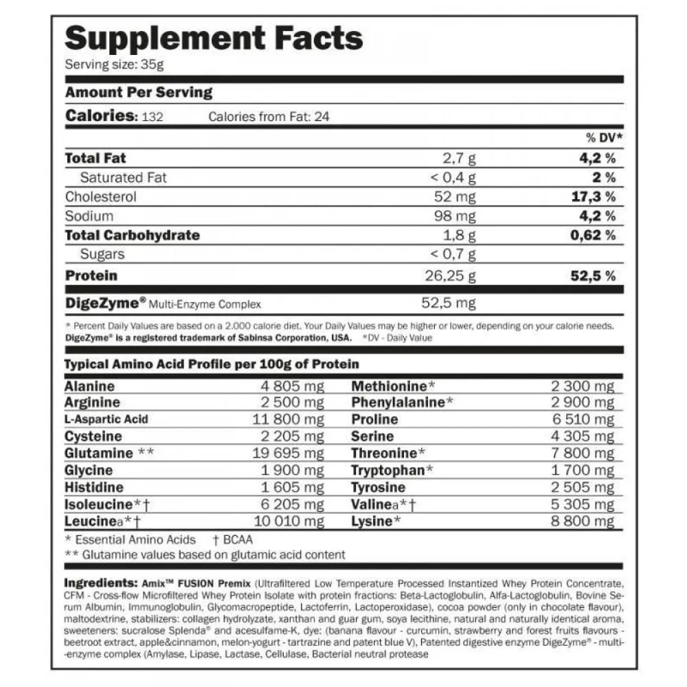 Whey pure fusion of amix ™ nutrition, is an excellent protein mixture that combines the milk serum concentrate and the isolated of the peak milk serum with a high content of both branched and essential amino acids. It is a very pure protein with a very low fat index, which for its natural qualities intervenes directly in the maintenance and creation of fat -free muscle mass, so it is ideal for those athletes who seek to increase their muscle mass and also for those people who want to lose fat.su ultra and microfiltrated process at low temperature offers us a protein of maximum purity, with excellent and rapid absorption, an ideal amino acid profile and a very high biological value. Principles benefits of whey pure fusion of amix ™ nutrition:- contains a mixture of high quality serum protein concentrate and inslated from cfm® glanbia original protein protein.- it has a very high biological value.- contributes to maintenance and growth and growth of muscle mass.- very low in fat and carbohydrates.- it provides 26.25 grams of the best serum protein by service.- potentiated with digezyme®, a patented enzymatic complex.- with excellent flavors and without aspartamo. – supulous with splenda® sucralosa.- 65 doses per container. Additional informationwhey pure fusion only contains ingredients of the highest quality and bioactive principles that make it one of the best market proteins. It contains biologically active peptides that regulate physiological processes, in addition to its nutritional value, such as alpha albumin, beta lacto albumin, immunoglobulin and glycomacropéptides. In addition, it also contains a large number of essential amino acids, which the organism is not able to produce and are very important to achieve perfect nutritional supplementation. Amino acids play a very important role in both muscle protection and in muscle growth, as well as in the recovery of muscle fibers after intense training. Finally, its very high level in glutamine helps us to optimal recovery after intense training. It continues the patented enzymatic complex digezyme® with digestive enzymes for complete absorption, making it very soft and digestive for the stomach. In addition, its excellent flavor and creamy texture completely free of aspartate make whey pure fusion one of the best proteins in the market. Fredients the whey fusion formula contains (serum protein concentrate processed by low temperature ultrafiltration, cfm (isolated from microfiltrated serum protein by cross flow with beta-lactoglobulin, alpha-lactoglobulin, albumin of bovine serum, immunoglobulin, glycomacropéptides, lactoferrin, lactoperoxidase), cocoa powder (in cocoa flavor), maltodextrin , exclusive complex of digestive enzymes digezyme® (amylase, lipase, lactase, cellulase, protease), acesulfamo k, succral. 200 ml of water, skim milk or their favorite drink. Preferably water. According to needs, the dose can be increased. 1 kilographical presentation mo.