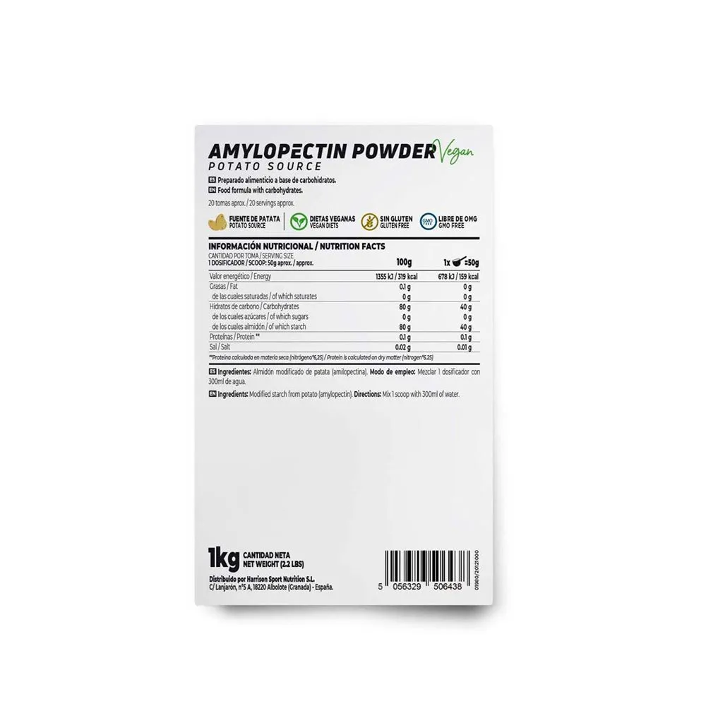 Potato amylopectin RAW. Unflavoured. Complex carbohydrate. Sugar-free and gluten-free. Easy digestion. Medium glycaemic index. Suitable for vegans.