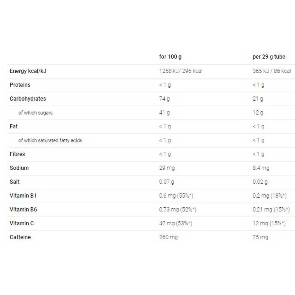 – glucose syrup (UE), water, guarana dry extract 2% (dry extract 10%), maltodextrin), soluble coffee 2%, natrium chloride, vitamins C, B6 and B1 (thiamin).