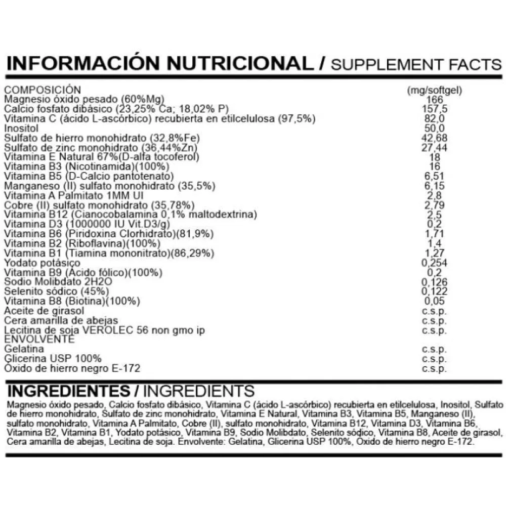 Bigman nutrition multi-vits is a high quality multivitamine and mineral supplement recommended as a complement in vitamin and mineral department states since it provides 100% of the recommended daily amount of the main vitamins. Taking a single capsule a day you provide to your organism the basic dose necessary in the case of training regularly.su formulation includes vitamin a, beta -carotene, vitamin d3, vitamin k, vitamin b1, vitamin b2, vitamin b6, vitamin b12, vitamin b3, vitamin b9, (folic acid), vitamin b5, biotin, vitamin e, vitamin c, potassium chloride, zinc oxide, ferrous fumarate, manganese gluconate, copper gluconate, potassium iodide, chromium picoline nutrition:- formula everything in an ideal one for athletes and any type of person.- extra contribution of vitamins of group b, antioxidants and minerals such as zinc, selenium and copper.- with u na single capsule a day is sufficient.- support for two full months.- improves physical and mental health.- easy to take. Additional information vitamins and minerals are essential molecules for life, since they are present in innumerable chemical and metabolic reactions that without them they could not be carried out. Multi-vits gives us all the vitamins and minerals necessary for a proper functioning of our body and avoids the possible shortcomings of any of these that could be harmful to our health. Multi-vits is ideal for both athletes and non -athletes who have high physical wear and need an extra energy contribution, which covers 100% all the needs of our body in states of physical or mental stress. Also and also in mental concentration and delaying the appearance of fatigue. It provides all the necessary vitamins for a proper functioning of our body and avoids the possible deficiencies of any of these that could be harmful to our health. Instracks vitamin a, betacarotene, vitamin d3, vitamin k, vitamin b1, vitamin b2, vitamin b6, vitamin b12, vitamin b3, vitamin b9, (folic acid), vitamin b5, biotin, vitamin e , vitamin c, potassium chloride, zinc oxide, ferrous fumarate, manganese gluconate, copper gluconate, potassium iodide, chromium picolinea, sodium selenite, magnesium phosphate, calcium carbonate, microcrystalline cellulose, magnesium stearate and silicon dioxide. Employment mode as dietary supplement for healthy adults, take 1 capsule a day along with breakfast. 60 capsules.