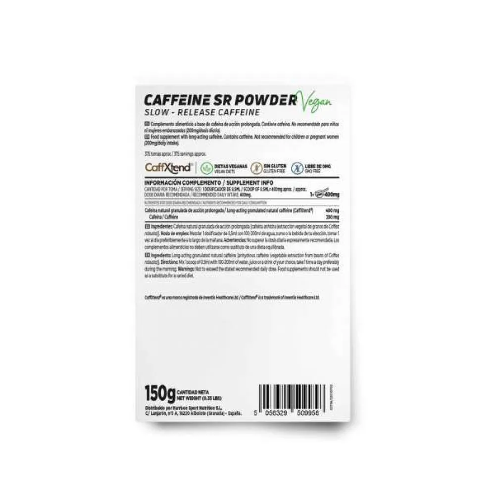400mg CaffXtend® slow release granular caffeine (50% pure caffeine). 200mg of pure caffeine per dosage. Convenient powder format. Suitable for vegans. Dairy Free,Egg Free,Fish Free,Gluten Free,Lactose Free,No Preservatives,Nut Free,Raw,Soy Free,Sugar Free,Suitable for Vegans,Suitable for Vegetarians,With no artificial colourings,Without GMOs. Store in a cool (below 25°C), dry and dark place. Do not exceed the stated recommended daily dose. Keep out of reach of the smallest children. Nutritional supplements should not be used to replace a balanced diet. Not advised for children nor pregnant women. Contains caffeine (200mg/daily dose). Caffxtend® is a registered trademark of Inventia Healthcare Ltd..