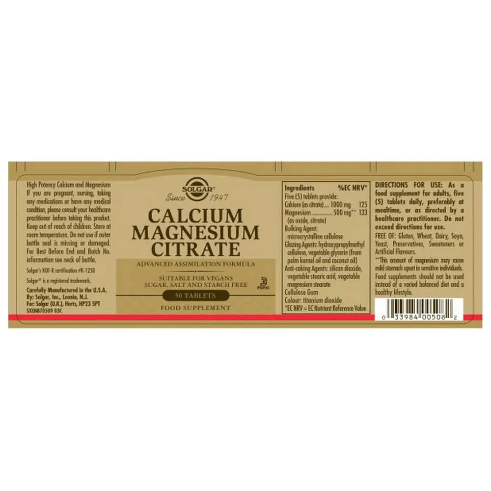 – Solgar® Calcium Magnesium Citrate Tablets Contains Key Nutrients Calcium And Magnesium. Calcium Is The Mineral Which Is Most Present In Our Body And Is Stored Mainly In Our Bones. It Is Required For Strong And Healthy Bones, And Teeth. When We Age The Absorption Of Calcium Decreases, Reason That We Should Make Sure We Have Enough Calcium In Our Diet By Eating Dairy Products Such As Milk, Yogurt, Cheese And Butter. Intake Of Adequate Amounts Of Calcium As Part Of A Healthy Diet, Along With Physical Activity, May Reduce The Risk Of Health Concerns Connected With Bones And Joints In Later Life. When We Are Not Able To Reach Adequate Levels Of Calcium Through Our Diet, A Supplement Might Be Advised. Magnesium Is Considered By Experts To Be A Vital Mineral Required By Every Organ Within The Body And Can Naturally Be Found In Leafy Green Vegetables. It Can Be Recommended For Everything From Promoting Restfulness, Supporting Muscle Function, To Releasing Energy From Food And So Relieving Tiredness, As Well As Aiding Towards A Balanced Mind. Solgar® Calcium Magnesium Citrate Is Available In A Citrate Form, Which Is A Highly Absorbable Form Of Magnesium Compared To The More Commonly Available Form Of Oxides. Magnesium Citrate Is Therefore Ideal For Those With Digestive Issues Or Those Who Do Not Absorb Other Mineral Forms So Easily. Solgar® Calcium Magnesium Citrate Delivers Magnesium And Calcium With 5 Tablets Daily, Supporting Your Optimal Wellbeing. Calcium Contributes To: Normal Muscle Function Maintenance Of Normal Bones And Teeth Magnesium Contributes To: Normal Functioning Of The Nervous System Energy Release And Reduction Of Tiredness And Fatigue Normal Muscle Function Maintenance Of Normal Bones Normal Psychological Function< All Solgar® Products Meet Our Industry Recognized “Gold Standard” For Excellence. Made Using Naturally Sourced Ingredients And Innovating Since 1947, Solgar® Is Your Perfect Supplement To Good Health – 98% Of Solgar® Consumers Recommend The Brand*