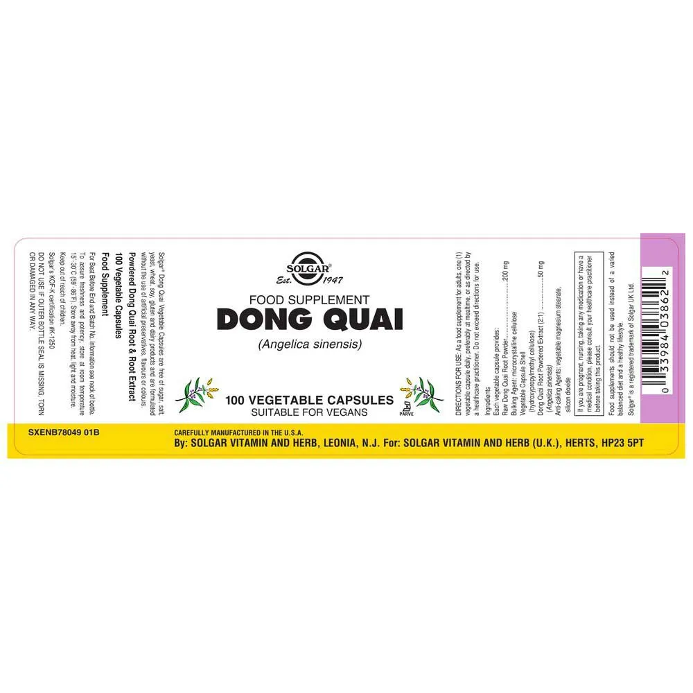 – Solgar® Dong Quai Contains Dong Quai And Is One Of Solgar®’S Botanical Range Products. Solgar®’S Botanicals Are Carefully Selected From Plants Growing In The Wild Or Cultivated On Special Botanical Farms. The Finest, Freshest Botanicals Are Chosen Based On A Strict Set Of Criteria Such As The Geographical Origin Of The Raw Material, The Authentication Of The Species And The Qualities Of The Raw Material. Botanicals Have Been Used By Mankind Since Early History As The Beneficial Effects Of Food Beyond Their Nutrient Function Have Been Recognised Since Early Times. They Have Been Used Through Centuries To Maintain Health And A Lot Of Today’S Medicines Were Originally Derived From Botanicals. Botanicals Are Still The Basis For Chinese Medicine And Are Important Constituents Of Many European Natural Remedies. As Hippocrates Said, ‘Let Thy Food Be Thy Medicine, Thy Medicine Be Thy Food’. Dong Quai (Angelica Sinensis) Is Also Known As Female Ginseng And Is An Herb Belonging To The Group Of Plants Which Also Include Parsley, Carrots And Coriander. It Can Be Found In The Mountains Of China, Japan And Korea, And Prefers The Cooler Climates. It Has Been An Ingredient In Chinese Traditional Medicine For Centuries, As Well As Being Used In Native American And Ayurvedic Medicine. The Root Has A Strong And Bitter Taste. Solgar® Dong Quai Is To Be Taken As 1 Vegetable Capsule Daily, Providing You With This Ancient Chinese Medicine. All Solgar® Products Meet Our Industry Recognized “Gold Standard” For Excellence. Made Using Naturally Sourced Ingredients And Innovating Since 1947, Solgar® Is Your Perfect Supplement To Good Health – 98% Of Solgar® Consumers Recommend The Brand*