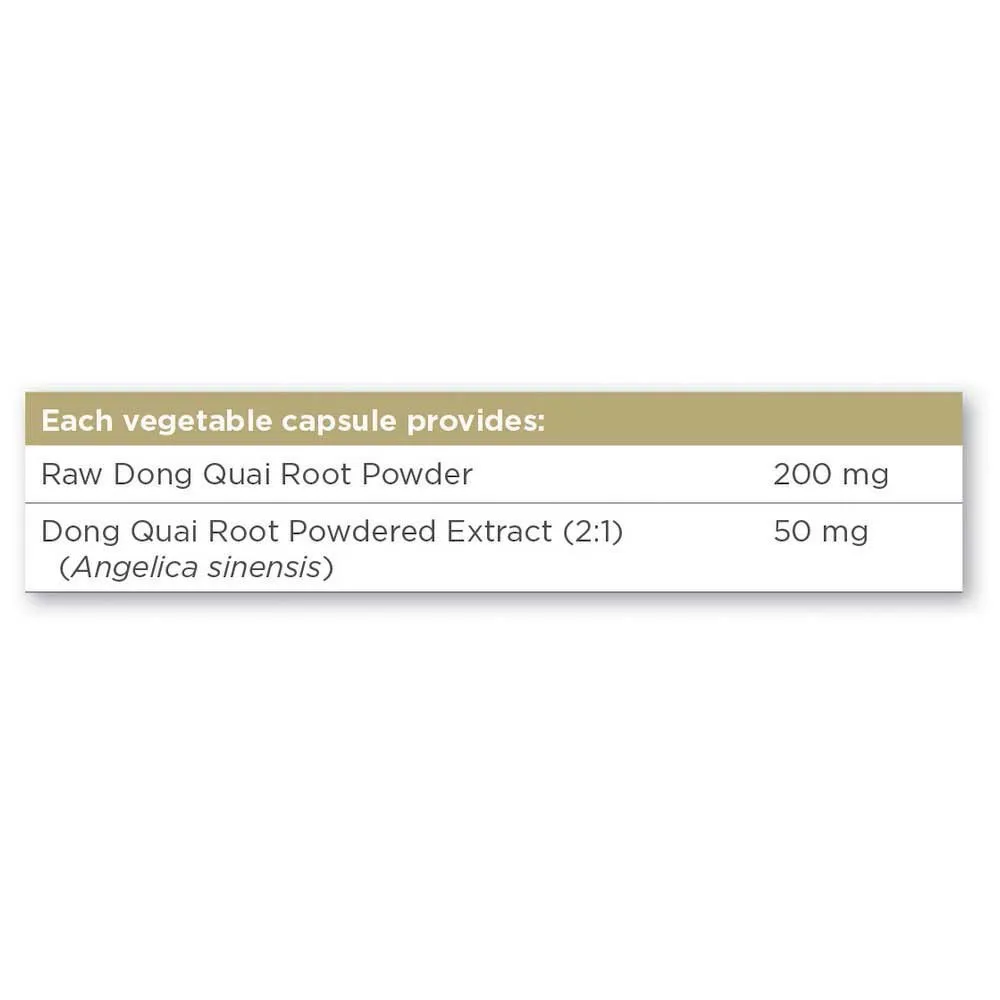 Raw Dong Quai Root Powder, Bulking Agent: Microcrystalline Cellulose, Vegetable Capsule Shell: Hydroxypropylmethyl Cellulose, Dong Quai Root Powdered Extract (2:1) (Angelica Sinensis), Anti-Caking Agents: Vegetable Magnesium Stearate, Silicon Dioxide.