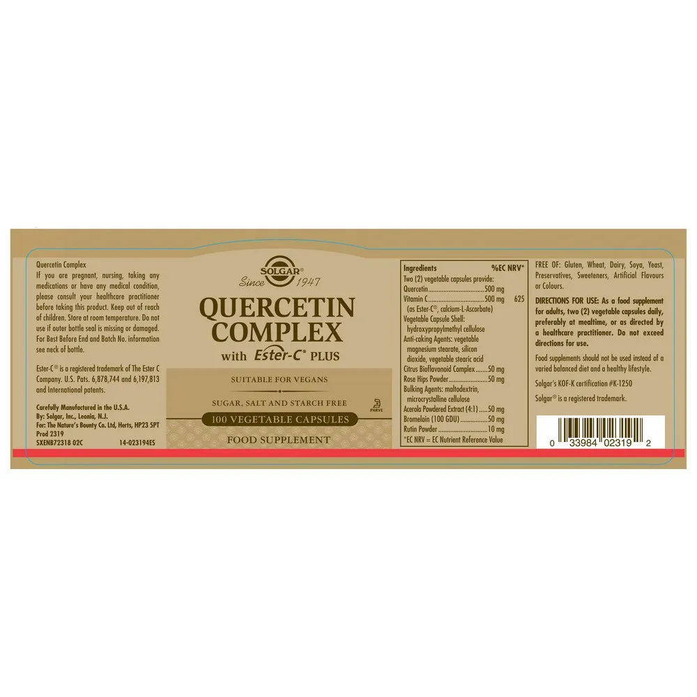 Solgar® Quercetin Complex with Ester C® Plus is exclusively formulated by Solgar and combines the important bioflavonoid Quercetin with Ester-C® and Bromelain.