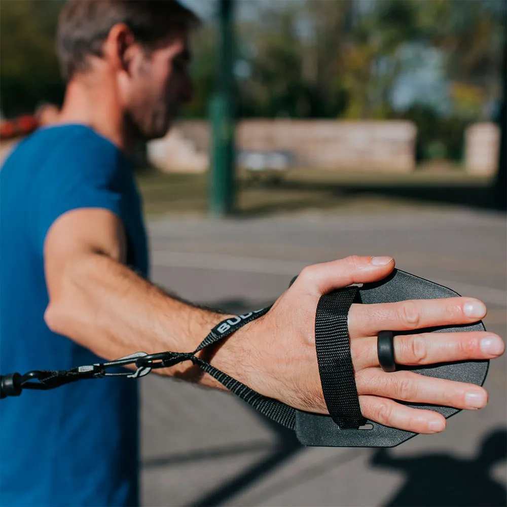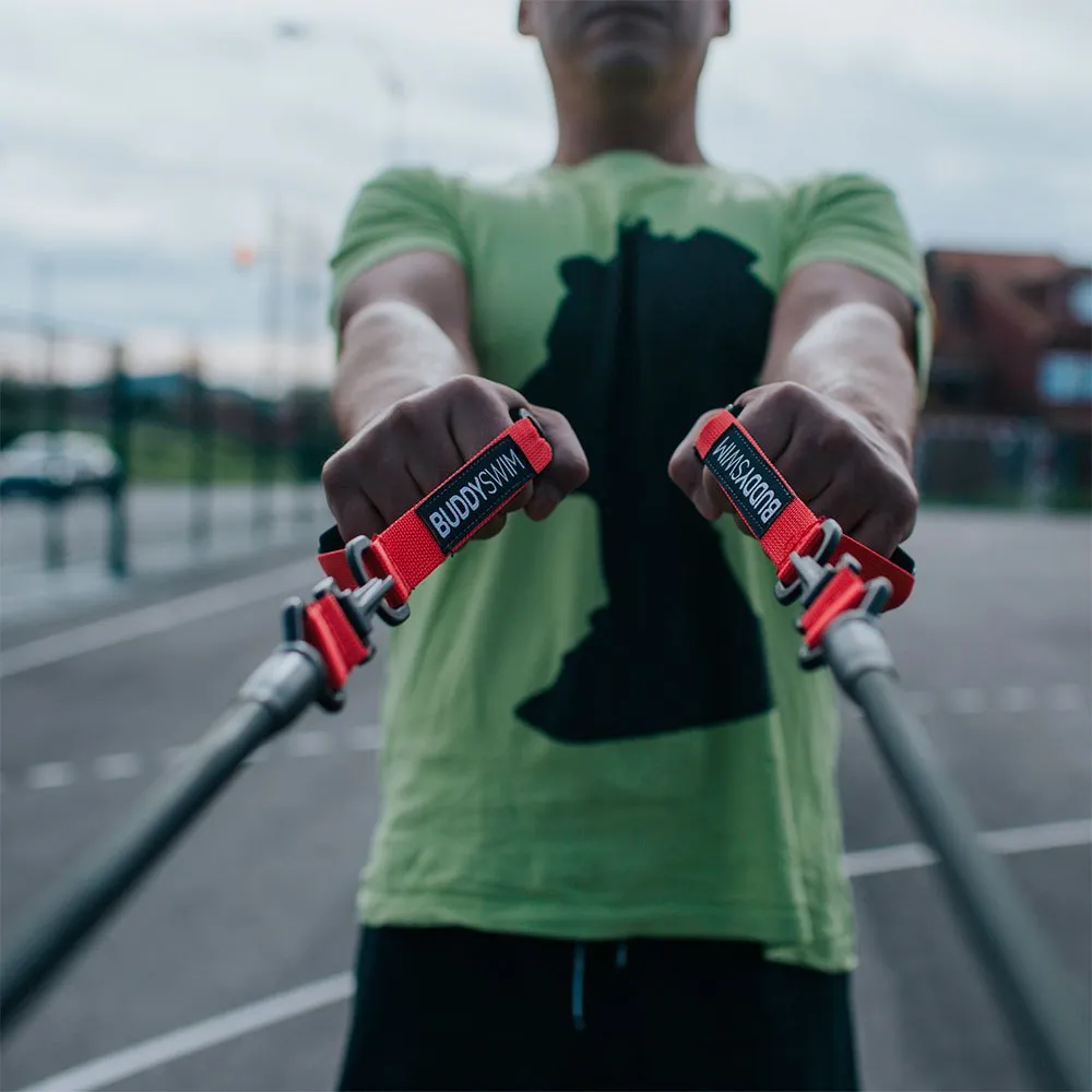 Super Stroke Buddyswim Dryland Cords with interchangeable paddles and handles are designed to simulate swimming movements out of the water. Training out of the water is an ideal complement to improve stroke resistant and technique. Thanks to the possibility to use of swim paddles or handles, the swimmer can perform endless training possibilities out of the water such as rotations, pulls, extensions, strengthening exercises and many more.