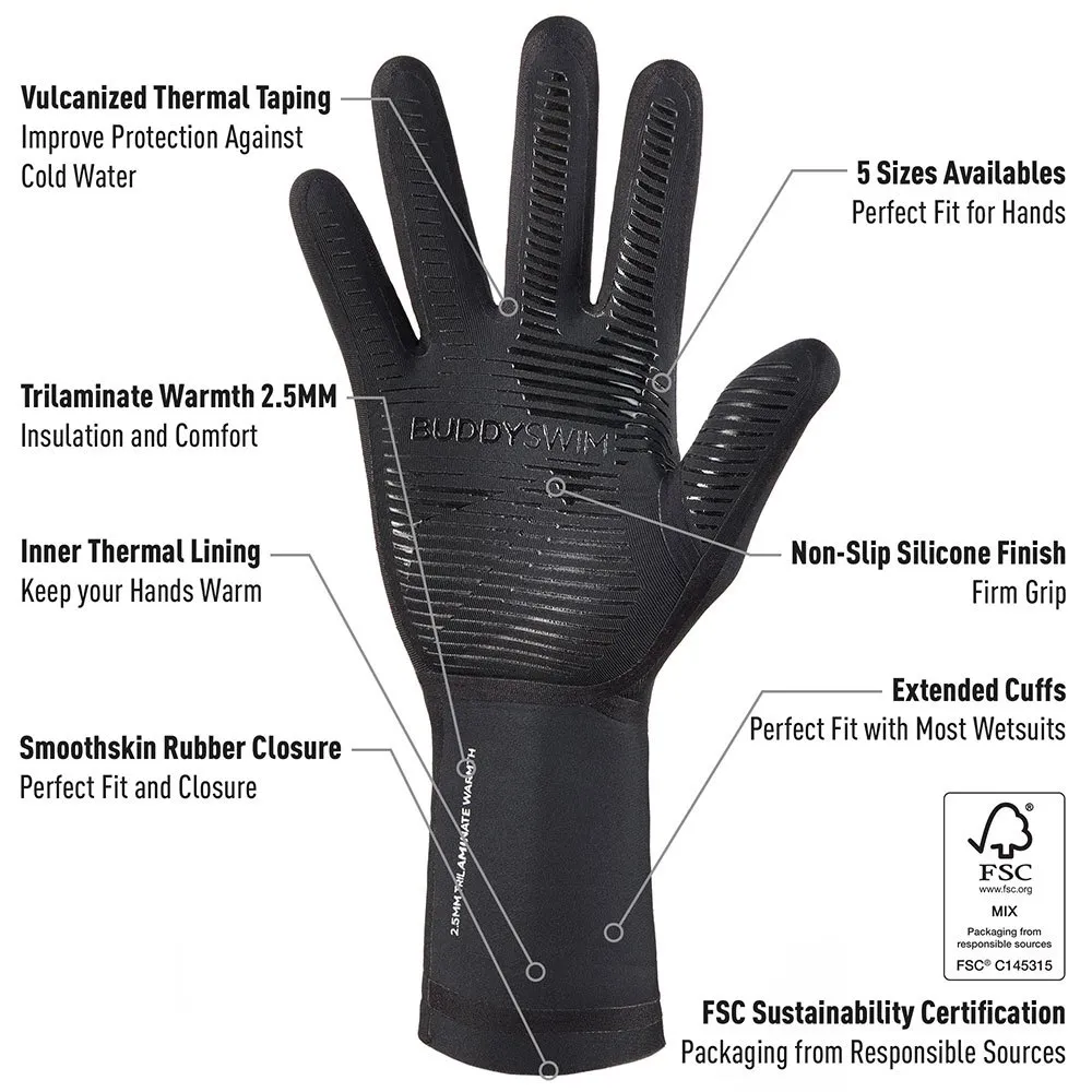 Buddyswim neoprene gloves are manufactured with 2.5 mm Trilaminate Warmth, an exclusive three-layer fabric and neoprene composition developed by Buddyswim. They offer maximum comfort and flexibility for all movements, as well as optimal protection from the cold.