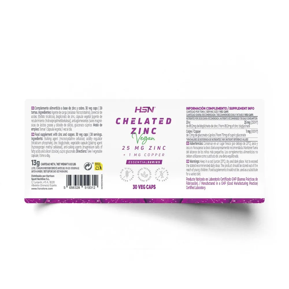 Zinc Bisglycinate (Chelated Zinc). 25mg of elemental Zinc. High concentration. With 100% of the Copper recommendations. Suitable for vegans.
