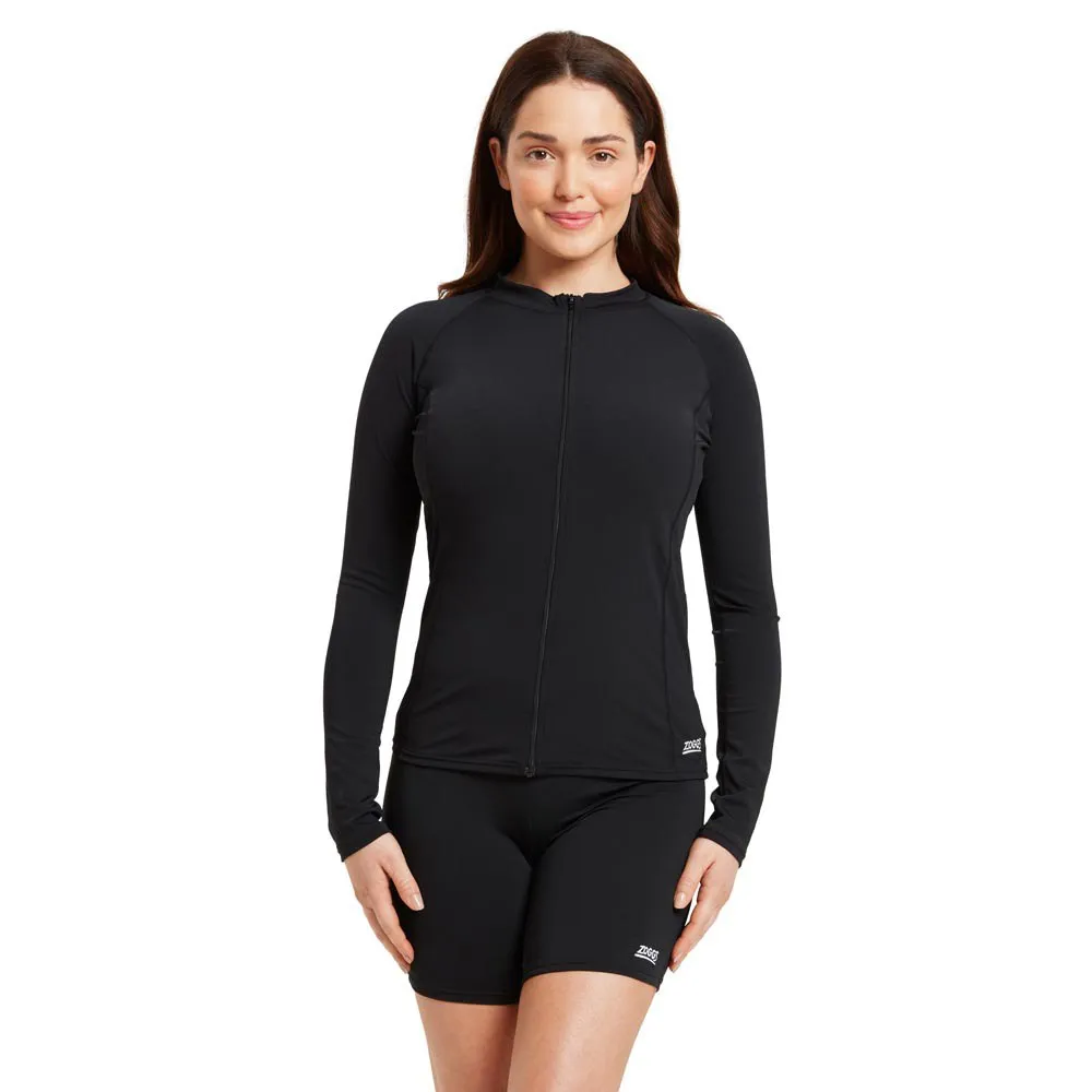 Protect yourself from the suns UV rays with our long sleeve zip front sun top. Ideal for swim instructors or for a day at the beach. With flat seams for comfort and easy zip front, this top is an essential in the Australian sun.